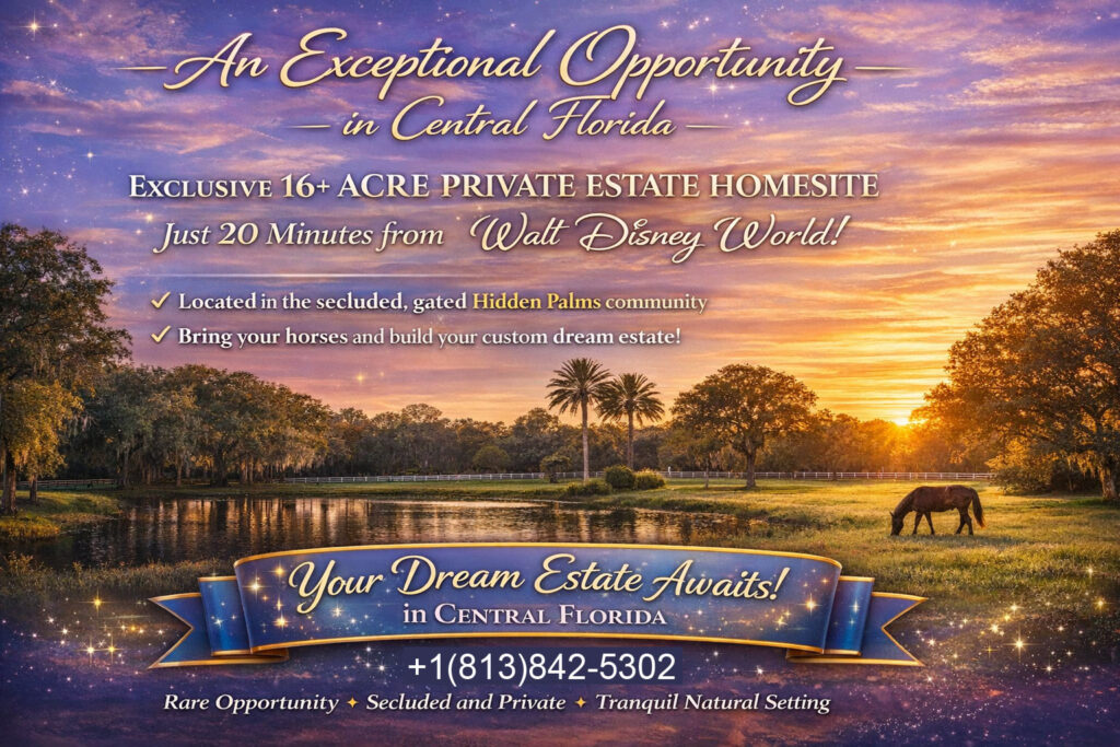 The 16-acre parcel at Hidden Palms is widely regarded as one of the most rare and high-appreciation land investments available in Central Florida in 2026 because it is currently the largest and most distinctive lot offered within the community, with no comparable property in size, condition, or location available on the Central Florida MLS. Acreage lots inside equestrian gated communities near Florida’s major tourist attractions are finite assets that cannot be replicated or mass-produced. As available supply within Hidden Palms diminishes, property values have only one direction to go, making early acquisition the most strategic financial decision for serious buyers and investors.